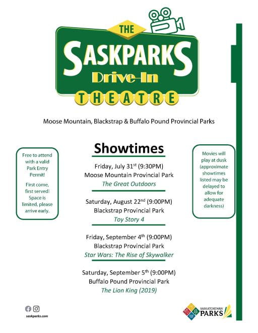 Drive-in movies are free to attend with a valid park vehicle entry permit. Visitors should note that space is limited and available on a first come, first served basis. Campsites are available in all Saskatchewan Provincial Parks until the end of September, for more information and to book a site, campers can visit https://saskparks.goingtocamp.com/.