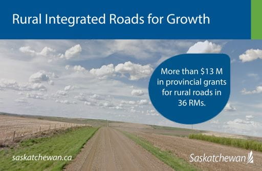The Provincial Government is investing $28 million to improve rural roads in Saskatchewan Rural Municipalities (RMs). Thirty-six RMs will receive funding this year, which will cover up to 50 per cent of total projects costs to a maximum of $500,000. This is the first year of a three-year plan with Saskatchewan Association of Rural Municipalities (SARM) to improve 100 rural roads through the Rural Integrated Roads for Growth Program (RIRG). The program will also provide grants to improve RM bridges. Details are being worked out and will be announced at a later date.
