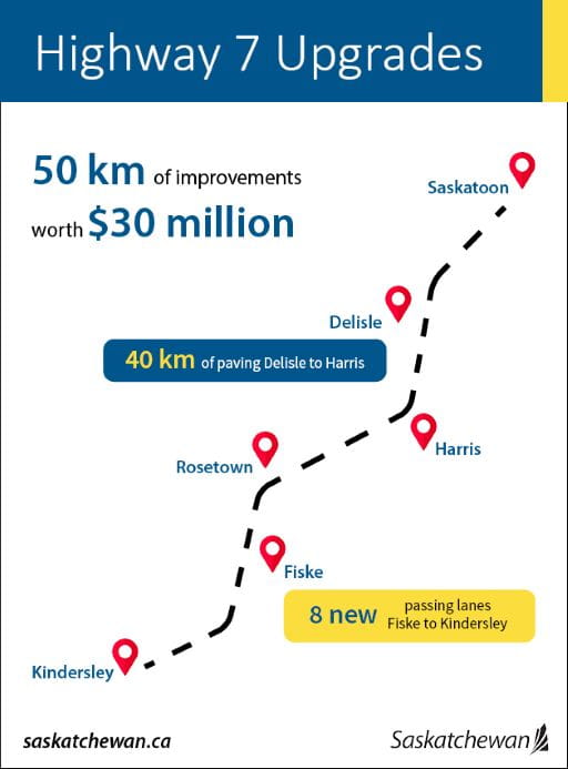 Since 2014, the Government of Saskatchewan has invested more than $120 million in safety improvements on Highway 7 between Saskatoon and Kindersley including twinning, passing lanes, intersection improvements and paving.