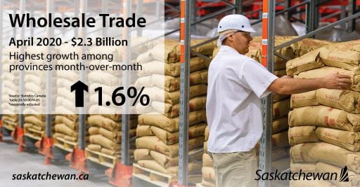 Saskatchewan’s wholesale trade in April 2020, was up 1.6 per cent (seasonally adjusted) over the previous month to $2.3 billion, the highest increase among the provinces and far ahead of the Canadian average of a decline of 21.6 per cent.
