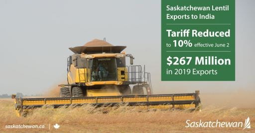 The Government of Saskatchewan also welcomes the recent announcement by the Government of India that tariffs on lentils have been temporarily reduced from 30 per cent to 10 per cent, effective from June 2 to August 31, 2020.