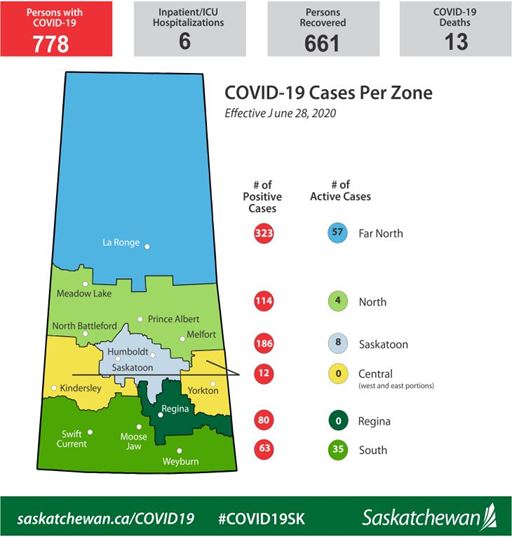 There is one new case of COVID-19 in Saskatchewan to report on June 28, 2020, bringing the Saskatchewan total to 778 cases. The new case is located in the Far North region.