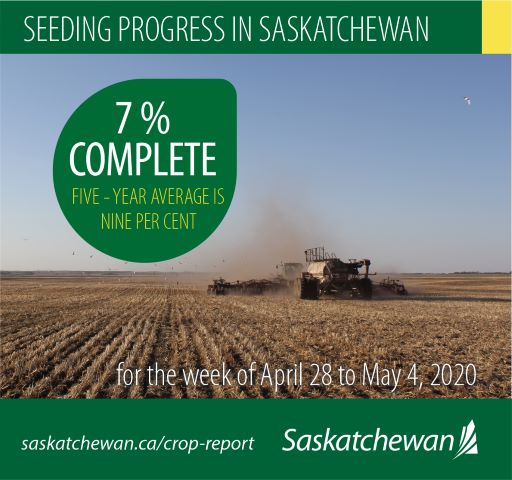 Seeding is underway in many parts of the province this week, with seven per cent of the 2020 crop now in the ground. This is just below the five-year average (2015-2019) of nine per cent for this time of year.