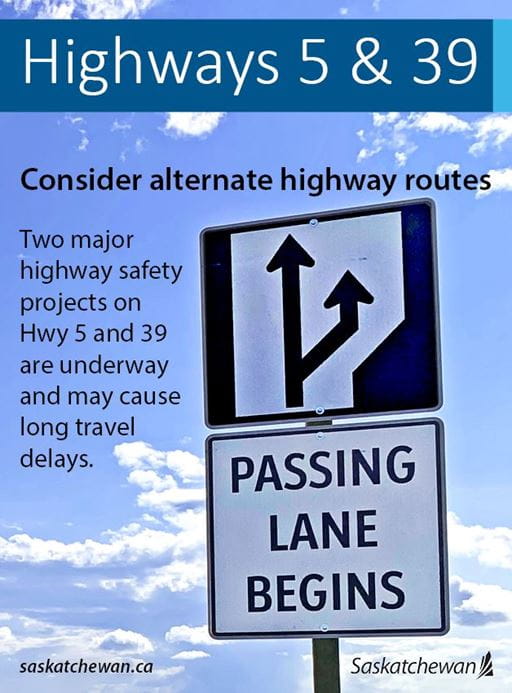 Major delays are expected on Highway 39 between North Portal and Rouleau as multiple construction crews will be working on more than 200 kilometres (km) of highway throughout the summer months. Drivers are advised to consider alternate routes, such as Highway 33, Highway 35 or Highway 47.