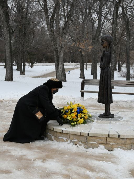 This year, due to COVID-19, a private memorial took place outside the legislative building. Ms. Wilson laid flowers in honour of the victims of Holodomor at the foot of the memorial statue in Wascana Park. The statue, an exact copy of Petro Drozdowsky’s “Bitter Memories of Childhood” statue, is a permanent reminder of this tragic genocide and was erected in Wascana Park in 2015.