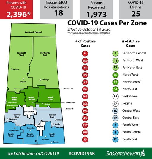 There are 66 new cases of COVID-19 to report in Saskatchewan on October 19, 2020, bringing the total to 2,396 cases. The new cases are located in the Far North West (3), Far North East (3), North West (4), North Central (17), North East (1), Saskatoon (25), Central West (2), Central East (2), Regina (8) and South West (1) zones.