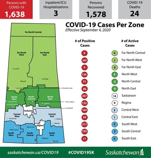 There are four new cases of COVID-19 to report in Saskatchewan on September 4, bringing the total to 1,638 reported cases. The new cases are located in the North Central (1), Central West (1), South West (1) and South Central (1) zones.