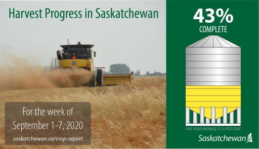 Producers made significant harvest progress this week with 43 per cent of the crop now in the bin, up from 28 per cent last week and remaining well ahead of the five-year (2015-2019) average of 35 per cent for this time of year. An additional 29 per cent of the crop is swathed or ready to straight-cut. While rain in some eastern and northern areas delayed harvest progress, the majority of the province continued harvest operations this week.