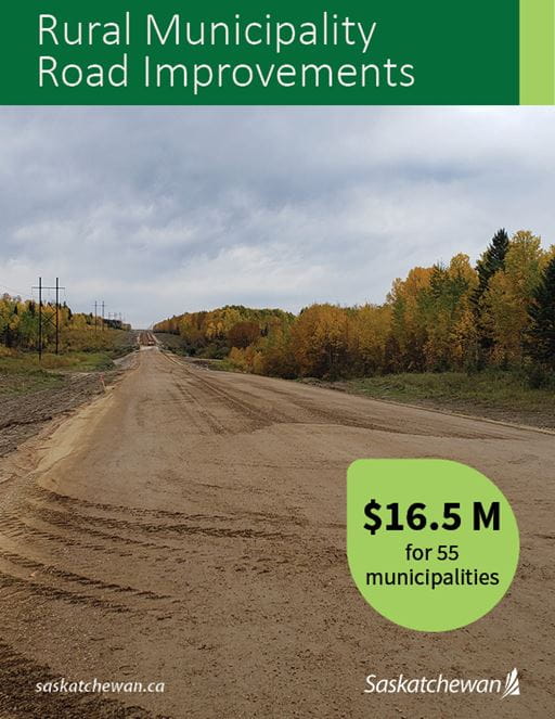 Road improvements are coming to 55 rural municipalities across Saskatchewan thanks to $16.5 million in funding from the provincial government’s two-year, $7.5 billion infrastructure stimulus plan.