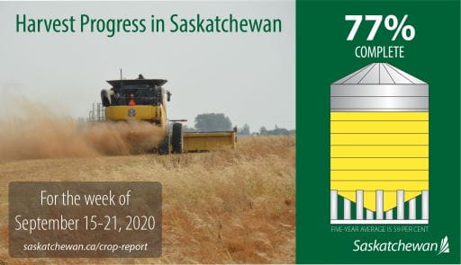 Seventy-seven per cent of the 2020 crop is currently in the bin, which is up from 62 per cent last week, and remains well ahead of the five-year (2015-2019) average of 59 per cent for this time of year. An additional 18 per cent of the crop is swathed or ready to straight-cut. Much of the crop coming off in the central and northern regions is tough and requires aeration or drying.