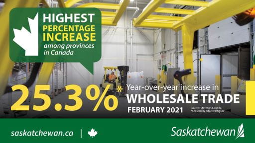 Today, Statistics Canada released indicators showing wholesale trade in Saskatchewan increased by 25.3 per cent (seasonally-adjusted) in February 2021 compared to February 2020, which was the largest percentage increase among the provinces. Nationally, wholesale trade increased by 6.5 per cent over the same period.