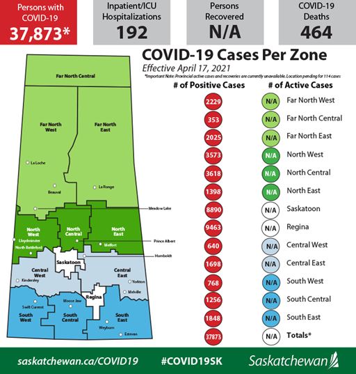 As of April 17, 4,529 variants of concern have been identified by screening in Saskatchewan, reported in the Far North West (21), Far North East (3), North West (59), North Central (51), North East (5), Saskatoon (424), Central West (52), Central East (164), Regina (2,792), South West (98), South Central (376) and South East (430) zones. There are 54 cases with residence pending.