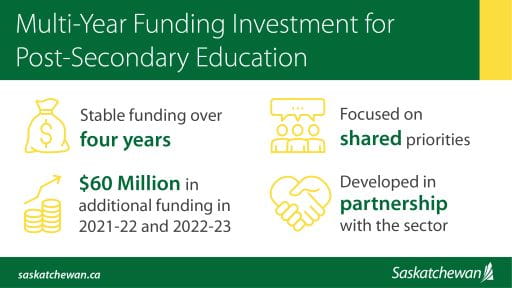 The Government of Saskatchewan in partnership with post-secondary institutions have developed a multi-year funding investment that will provide funding certainty to the sector over the next four years.