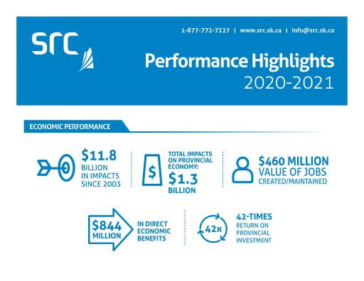 SRC's economic impact assessment for 2020-21 shows impacts of more than $844 million in direct economic benefits to the province - the second highest year on record. In addition, the work done at SRC contributed to the creation or maintenance of at least 6,000 jobs in Saskatchewan, valued at an additional $460 million.