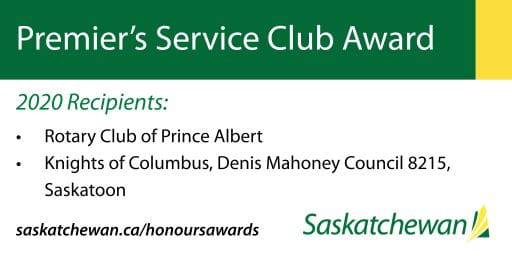 The Premier's Service Club Award was established in 2013. It recognizes non-profit service clubs and fraternal organizations that perform charitable work, either through hands-on efforts or through fundraising for other organizations. The Knights of Columbus, Denis Mahoney Council 8215, Saskatoon and the Rotary Club of Prince Albert will each be presented with their awards in early 2022.