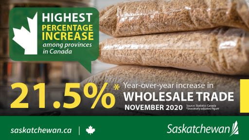 Saskatchewan’s wholesale trade was up 21.5 per cent (seasonally adjusted) in November 2020 when compared to November 2019, the highest percentage increase among the provinces. The value of Saskatchewan’s wholesale trade in November 2020 was $2.46 billion.
