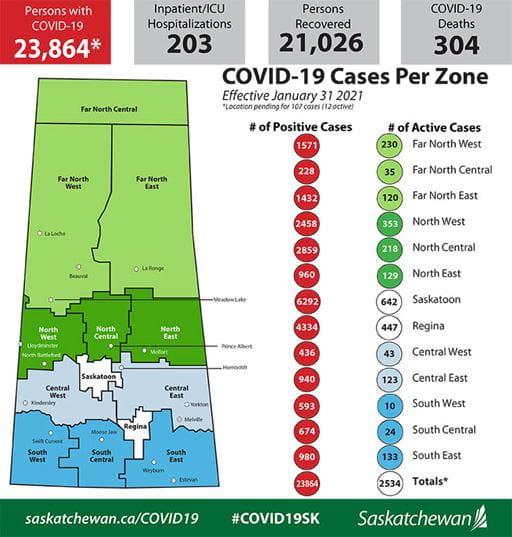 There are 238 new cases of COVID-19 to report in Saskatchewan on January 31, bringing the provincial total to date to 23,864 cases.