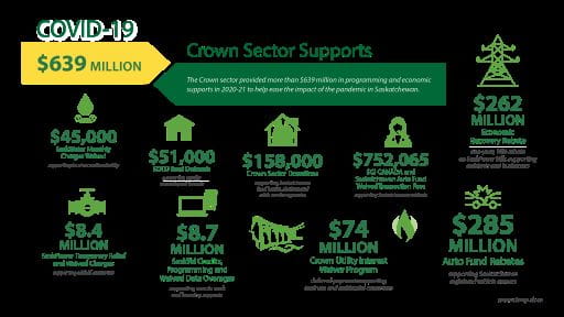 Pandemic supports also included $285 million for Auto Fund Rebates, $262 million for a 10 per cent rebate on SaskPower bills, $74 million in deferred payments through the Crown Utility Interest Waiver Program, $8.4 million in oilfield relief through SaskPower, and $8.7 million for SaskTel credits and waived data overage charges.