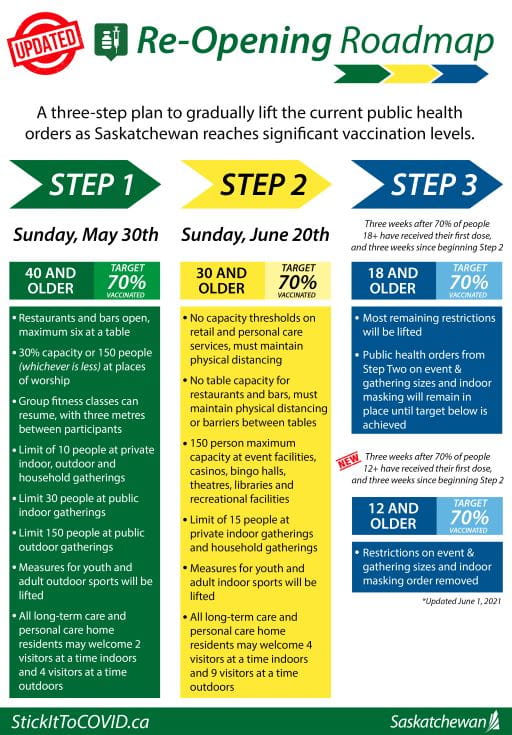 The Government of Saskatchewan has updated the Re-Opening Roadmap to include a vaccination threshold for the removal of all remaining public health restrictions, including mandatory masking and limits on gathering sizes.