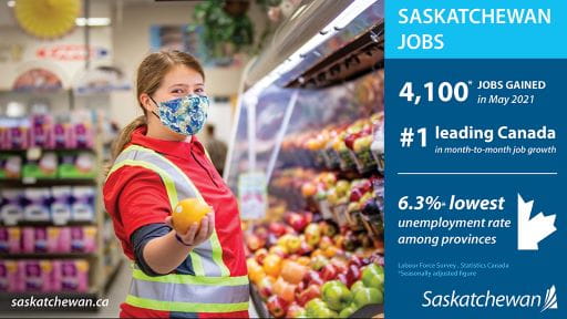 According to job numbers released by Statistics Canada for May 2021, while employment nationwide was down by 68,000 or 0.4 per cent from April, the number of people working in Saskatchewan grew by 4,100 or 0.7 per cent which was the highest growth in terms of both number and percentage change among the provinces (seasonally adjusted).