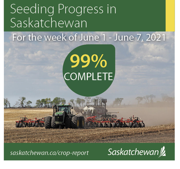 Seeding is virtually complete throughout the province at 99 per cent of the crop seeded, with a few fields being seeded for green feed and silage. This is ahead of the five-year average (2016-20) of 97 per cent.