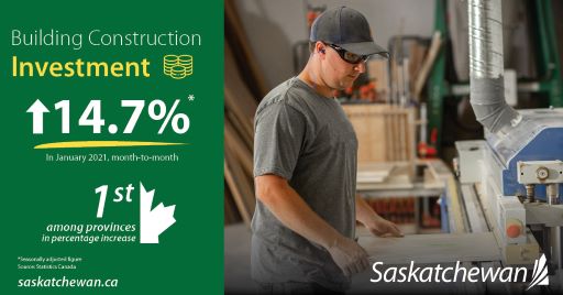Today, Statistics Canada released January 2021 Investment in Building Construction numbers, with Saskatchewan seeing a 14.7 per cent increase from December 2020, including a 21.2 per cent increase in residential building construction. Saskatchewan also saw a 12.5 per cent increase in January 2021 compared to January 2020. The value of building construction investment in January 2021 was $307 million.