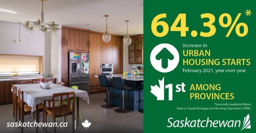 Also today, a Canada Mortgage and Housing Corporation release on urban housing starts for February 2021 shows Saskatchewan starts were up by 64.3 per cent over last February (seasonally unadjusted), the highest percentage increase when compared with the other provinces.