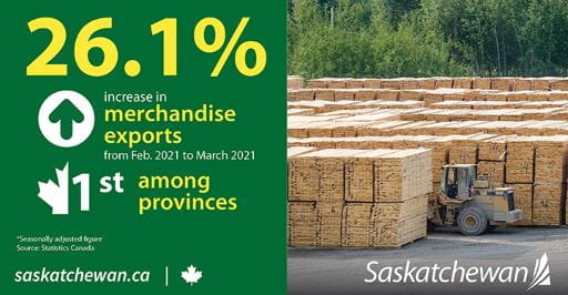 Merchandise export numbers released by Statistics Canada today ranks Saskatchewan first among the provinces for merchandise exports, with a 26.1 per cent increase (seasonally unadjusted) for March compared to February 2021.
