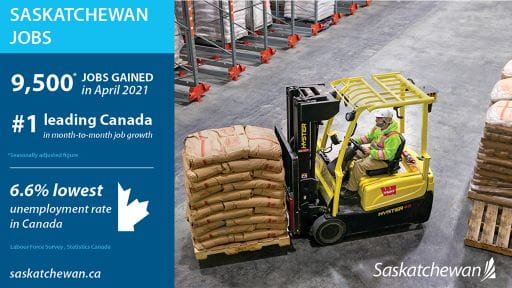 Statistics Canada today released job numbers for April 2021 which shows Saskatchewan had the lowest unemployment rate in Canada and led the nation in month-to-month job growth.