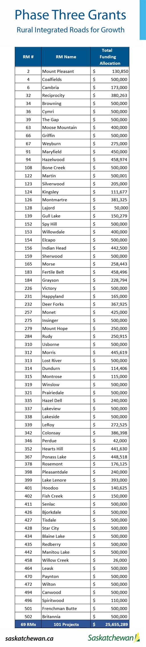The Government of Saskatchewan is continuing to invest in the improvement of rural roads through its Rural Integrated Roads for Growth (RIRG) program. Phase three, taking place during the 2021-22 budget year, will see 69 rural municipalities (RMs) receive $25.7 million in RIRG funding.