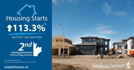 Today, a Statistics Canada release on housing starts for April 2021 shows positive signs of strong economic recovery in Saskatchewan. Urban housing starts in the province increased 113.3 per cent year-over-year, the second highest percentage growth increase among the provinces. Nationally, housing starts increased by 63.2 per cent.