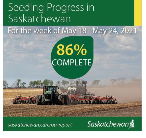 Even with the prolonged rain experienced across the province over the week, producers were still able to seed throughout all regions. Eighty-six per cent of the crop is now seeded in Saskatchewan, which is ahead of the five-year average (2016-2020) of 77 per cent for this time of year. Recent rains will greatly improve crop germination and emergence in many parts of the province that were delayed due to dry conditions.