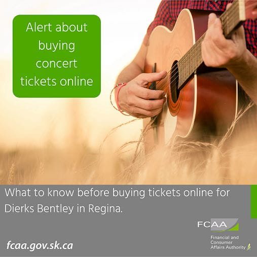Tickets to Dierks Bentley's concert on January 15, 2022, in Regina go on sale this Friday, November 5. The Consumer Protection Division of the Financial and Consumer Affairs Authority (FCAA) wants to remind you if you're planning on buying a concert ticket within the first 48 hours of going on sale, make sure you buy from a primary seller such as Ticketmaster or the concert venue.
