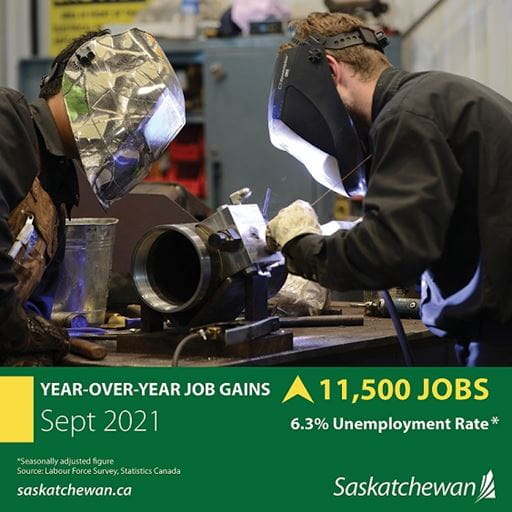 Today, job numbers released by Statistics Canada for September 2021 show Saskatchewan's unemployment rate fell to 6.3 per cent from 7.1 per cent a year ago, and well below the national average of 6.9 per cent (seasonally adjusted).