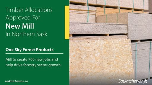 Today, the Government of Saskatchewan announced the approval of timber allocations to support the proposed One Sky Forest Products (One Sky) Oriented Strand Board (OSB) mill in Prince Albert.