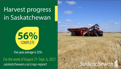 Producers have made tremendous progress as 56 per cent of the crop is now in the bin, up from 36 per cent last week, ahead of the five-year (2016-2020) average of 35 per cent. An additional 24 per cent of the crop is swathed or ready to straight-cut. There were several areas affected by rain delays but the majority of the province was able to continue their harvest operations without issue.