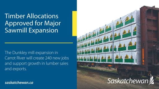 Today, the Government of Saskatchewan announced the approval of timber allocations to support the proposed expansion of the Dunkley Lumber sawmill in Carrot River.