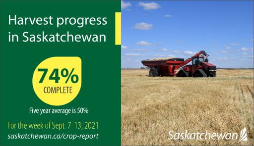 Producers continued to make quick progress in their harvest operations this week. Seventy-four per cent of the crop has been combined, up from 56 per cent last week and well ahead of the five-year (2016-2020) average of 50 per cent for this time of year. An additional 17 per cent of the crop is swathed or ready to straight-cut. Warm and dry weather is desired to continue drying down crops and allow harvest to continue without delay.