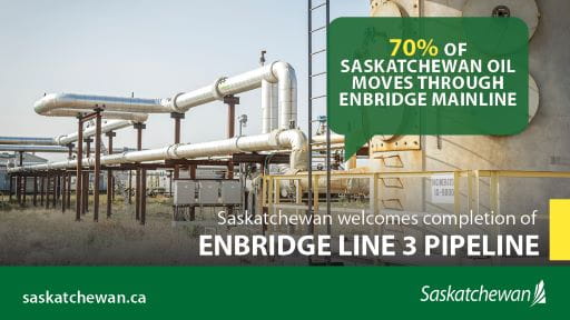 The Government of Saskatchewan welcomes the news of the completion of the Enbridge Line 3 replacement pipeline, which stretches from Alberta, through Saskatchewan and Manitoba, to Wisconsin.