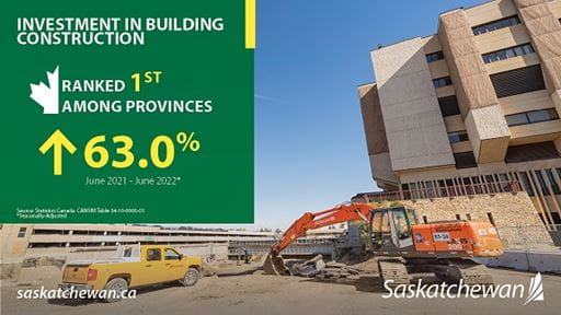 Today, Statistics Canada released June 2022 Investment in Building Construction numbers, which showed Saskatchewan with a 63.0 per cent increase (seasonally adjusted) compared to June 2021, ranking first among the provinces in terms of percentage change.