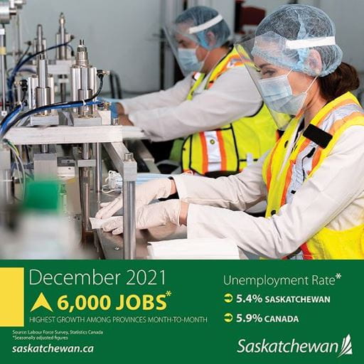 Today, job numbers released by Statistics Canada for December 2021 show Saskatchewan's month-over-month employment (seasonally adjusted) increased by 6,000 (up 1.1 per cent) from November 2021, which was the highest growth among provinces in terms of percentage change.