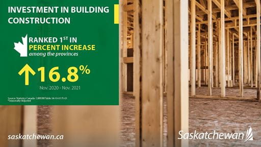Today, Statistics Canada released November 2021 Investment in Building Construction numbers, with Saskatchewan seeing a 16.8 per cent increase (seasonally adjusted) in investment from November 2020 to November 2021, ranking first among the provinces in terms of percentage change. Investment in residential building construction led the year-over-year growth with an increase of 20.4 per cent.