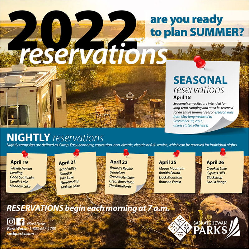 Reservations for the 2022 camping season at Saskatchewan's Provincial Parks are set to begin April 18 for seasonal campsites and April 19-26 for nightly, Camp-Easy and group campsites.