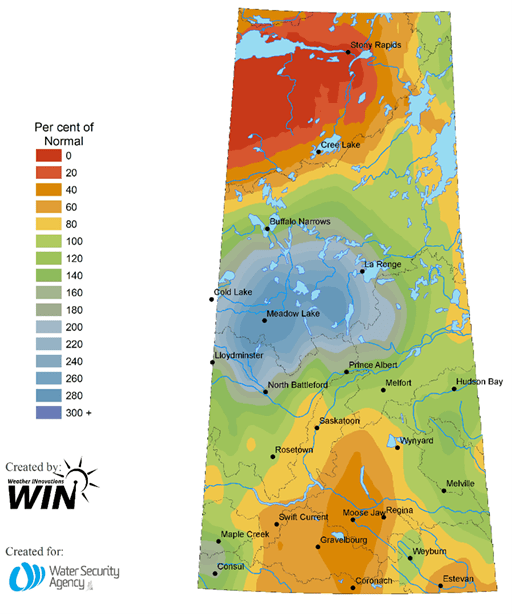 In the southeast corner of the province, lower than normal rainfall helped dry out areas that had become saturated, allowing flows to recede. The central grain belt also saw lower than normal precipitation resulting in drier than normal soil conditions there. Heavy rainfall localized in the upper portion of the Wascana Creek Basin generated high runoff resulting in some flooding of agricultural land in the Kronau Marsh area.