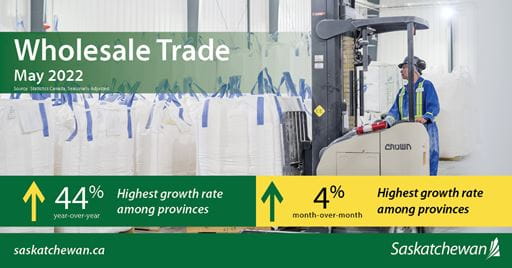 Saskatchewan has once again led all provinces in a key economic indicator, with the value of wholesale trade increasing by 44 per cent (seasonally adjusted) between May 2021 and May 2022. In comparison, the province with the second highest growth during this time period was Alberta, which saw an increase of 20.6 per cent.