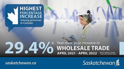 "Strong wholesale trade numbers are yet another sign of the strength of Saskatchewan's economy," Trade and Export Development Minister Jeremy Harrison said. "With significant investment coming into our province and a continued focus on international engagement, we will continue to tell Saskatchewan's story to the world."