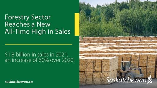 Saskatchewan's forestry sector reached an all-time high of $1.8 billion in forestry product sales in 2021, an increase of 60 per cent from 2020.