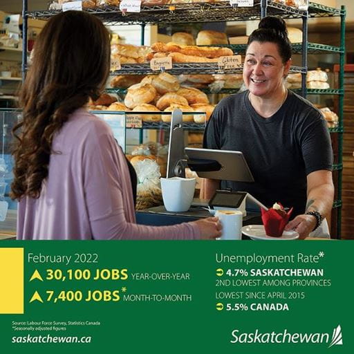 "With significant job gains and a low unemployment rate that continues to drop, Saskatchewan's economy is on the right track as we come out of the pandemic and transition to living with COVID-19," Immigration and Career Training Minister Jeremy Harrison said. "With record agricultural and merchandise exports in 2021, and the strongest year-over-year growth in manufacturing sales and wholesale trade in Canada, opportunities abound for businesses, entrepreneurs, and workers in Saskatchewan."