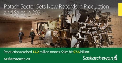 The potash sector in Saskatchewan hit all-time record highs in 2021, with production reaching 14.2 million tonnes K2O and the value of sales hitting $7.6 billion.