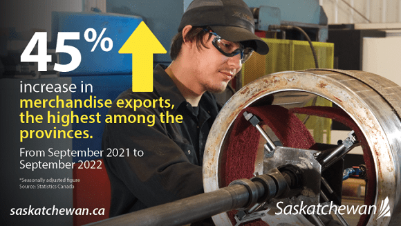 Today, Statistics Canada released numbers showing that Saskatchewan's merchandise exports increased by 45 per cent in September 2022 compared to September 2021, the highest increase among the provinces on a seasonally adjusted basis.